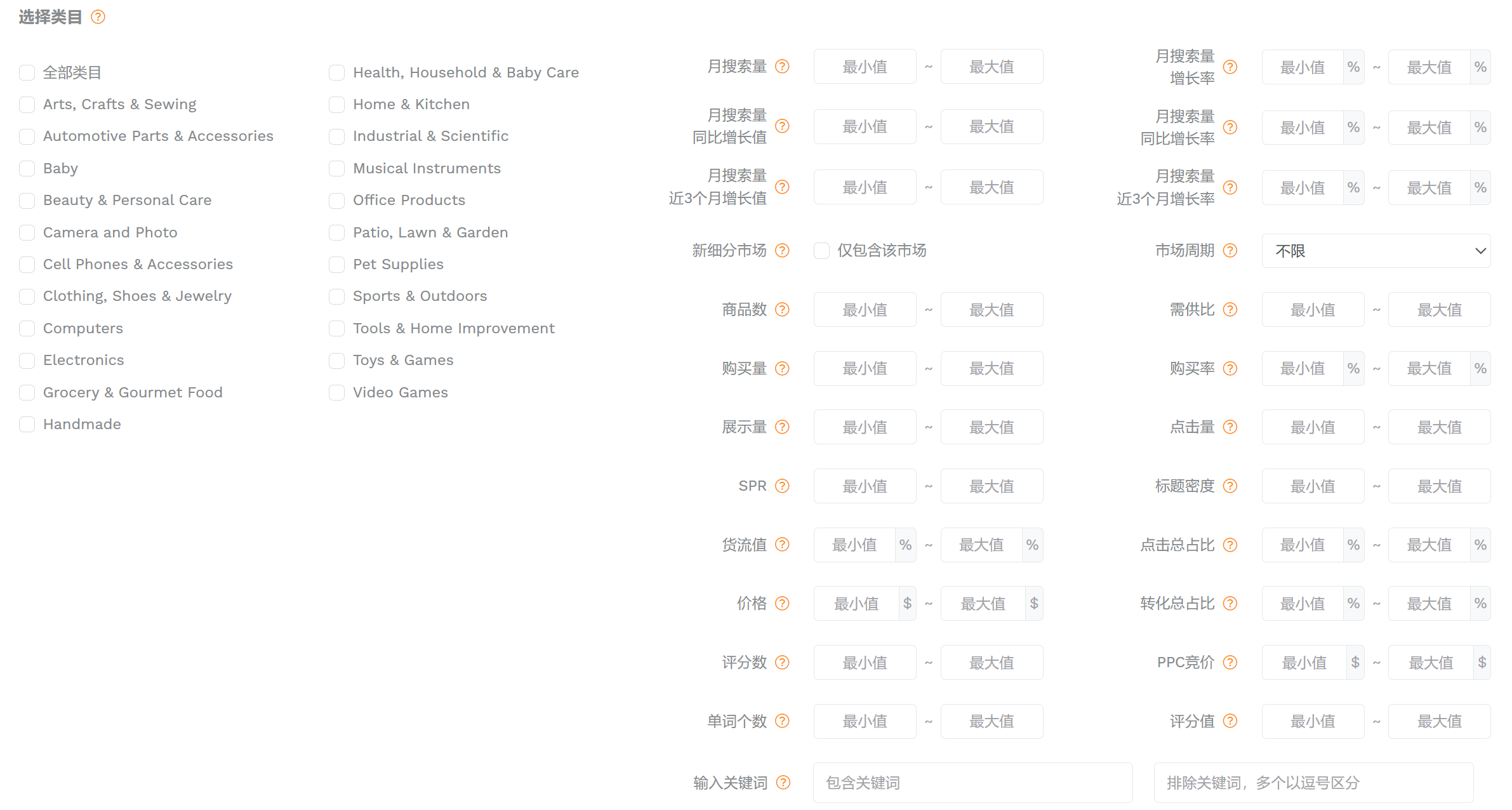 结合自身情况,在【关键词选品】中选择目标类目,设置好筛选条件进行搜索。条件越详细越好,重点设置: