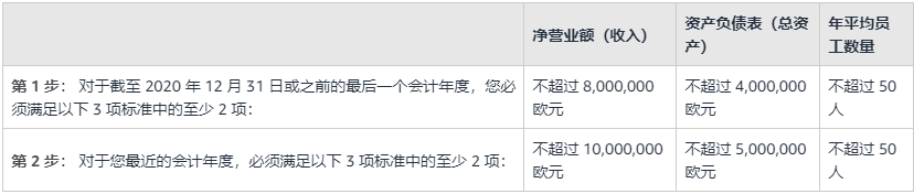 要获得享受六个月宽限期的资格,您必须在 2020 年 12 月 31 日符合“小型和微型经营者”的欧盟法律定义,并在您最近的会计年度中一直是“小型和微型经营者”。