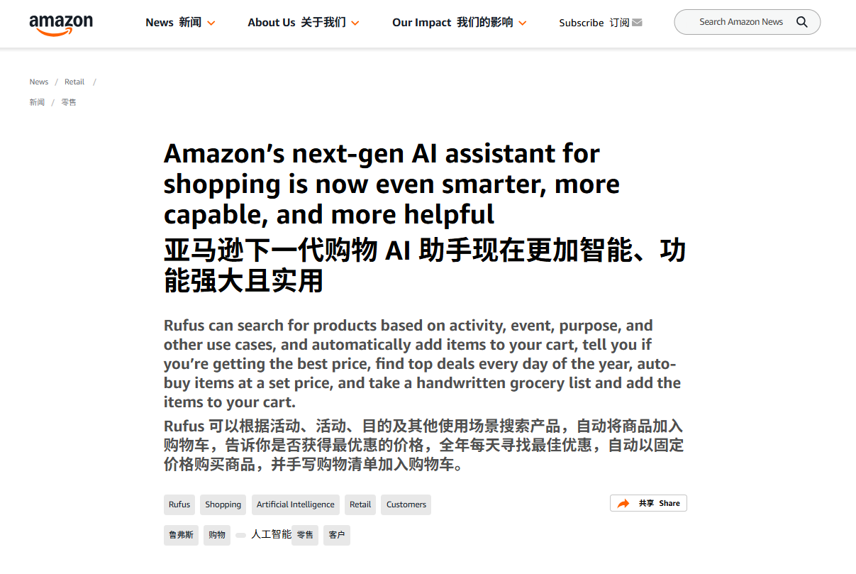 各位亚马逊卖家注意!近期,亚马逊正式对外公布了关于 Rufus AI 助手的能力更新说明。Rufus已经远远超出了问答的范畴,它正在成为商品搜索、视觉检索、价格匹配、自动下单的入口。作为亚马逊卖家,我们必须读懂背后的信号,提前布局。