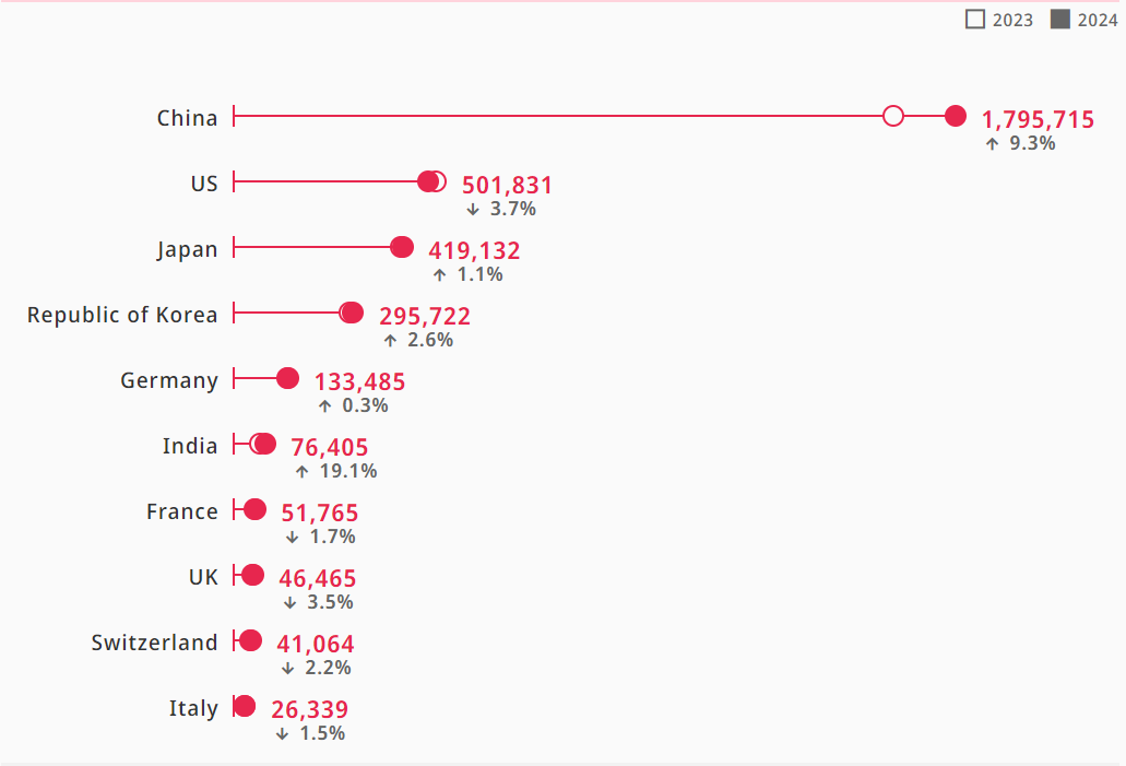 在前五大来源国中,德国(+7.9% ) 2024 年申请量增速最快,意大利( +5.2% )和中国( +2.7% )紧随其后。相比之下,美国( -3.8% )和大韩民国( -0.1% )出现下滑。