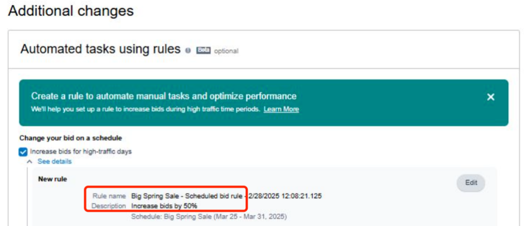 其实,这并非亚马逊第一次在旺季或大促前默认提高广告竞价。早在 2025 年 3 月亚马逊春促之前,就出现过类似情况。当时卖家在广告后台的“Additional changes”界面,打开“Automated tasks using rules”,在新规则(New rule)中会看到“Increase bids for high - traffic days”的框框是默认打勾的,而该规则指向亚马逊 3 月的春季大促,竞价同样默认提高 50%。