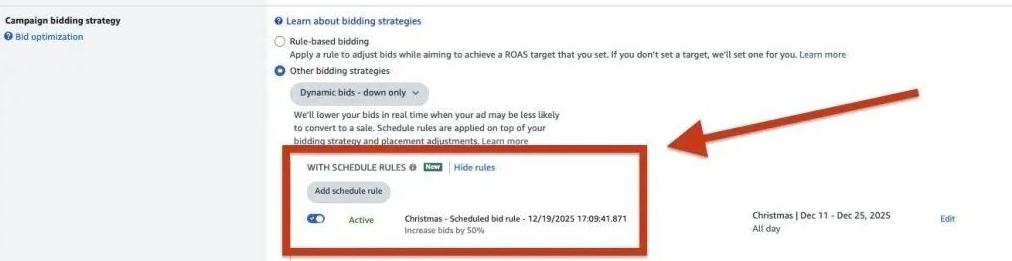 临近圣诞节,许多卖家发现广告费用消耗速度明显加快。深入探究后发现,原来是广告活动的竞价被默认调高了 50%!当卖家打开后台创建或管理广告时,在“Campaign bidding strategy”处,点击“Other bidding strategies”,再选择“WITH SCHEDULE RULES”,会看到在 12 月 11 日 - 25 日这个圣诞节购买高峰期,默认规则为“Increase bids by 50% All day”。