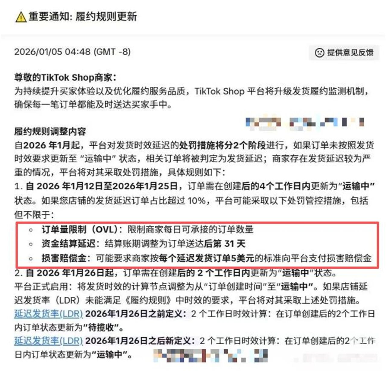 2026年1月5日,TikTok Shop发布升级履约规则通知,并分为两个阶段,对卖家发货时效提出更严苛要求。