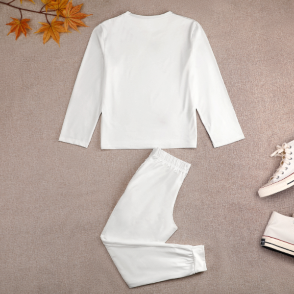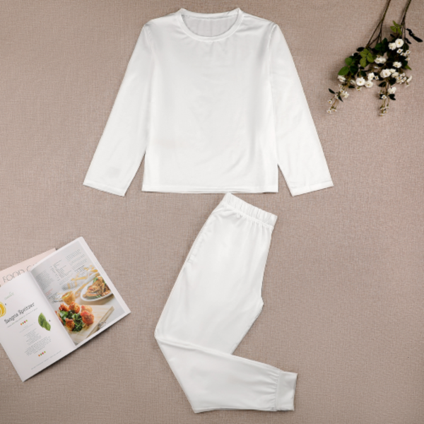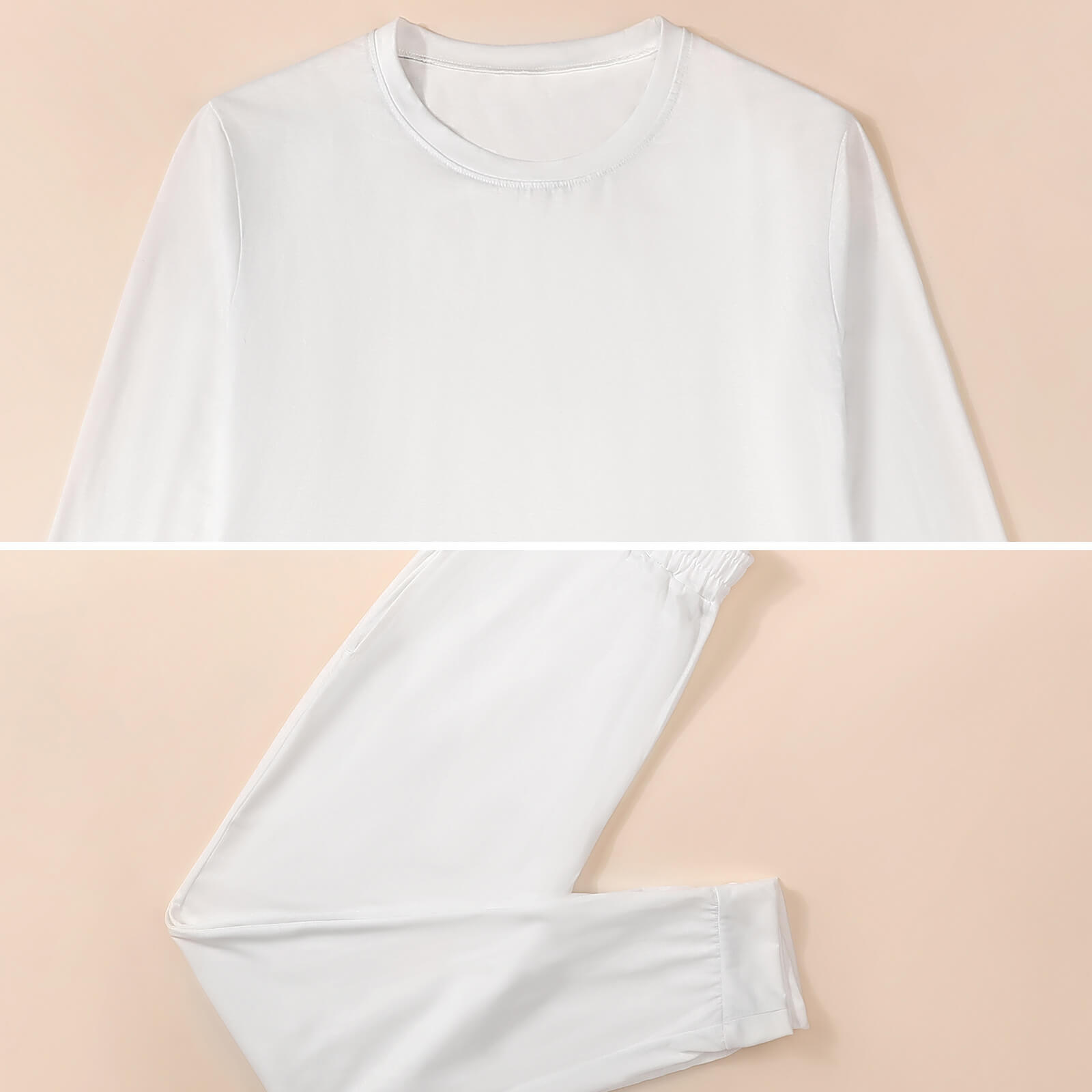睡衣风格:这款睡衣两件套包括一件舒适的圆领长袖上衣和一条长裤。两者都可以设计简单的图案和风格。